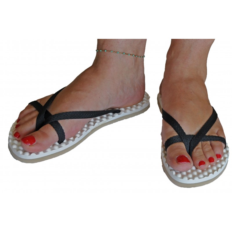 Nos tongs massantes utilisent le principe de la réflexologie plantaire et massent l’ensemble du pied, participant ainsi à un rééquilibrage après une longue journée. Un effet « défatiguant » du pied et stimule la circulation.